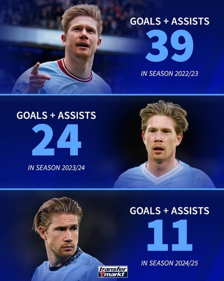 2025-03-16 08:45:51能否續(xù)約?33歲德布勞內(nèi)近3賽季參與進球數(shù)逐年下滑:39→24→11