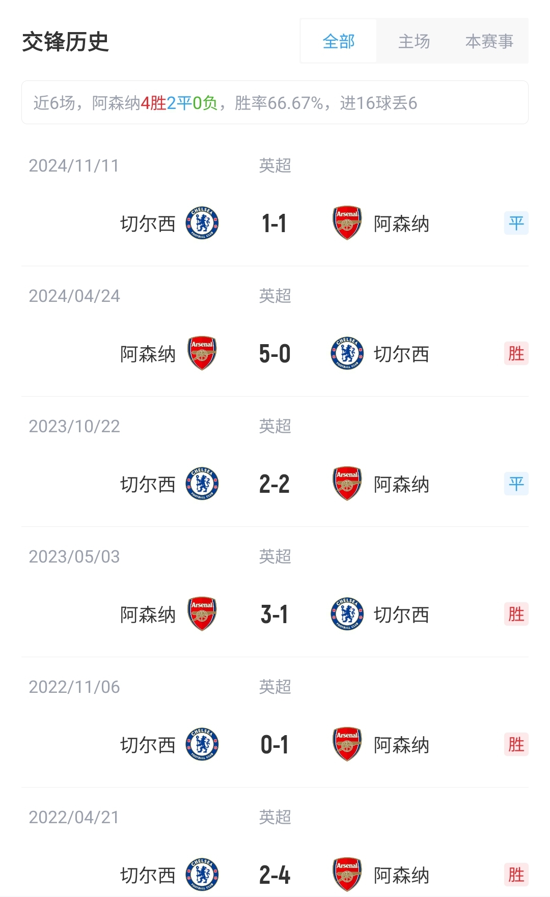 目前英超積分榜上,阿森納15勝10平3負積55分,位列第2;切爾西14勝7平7負積49分,位列第4。近6次交手,阿森納4勝2平保持不敗。
