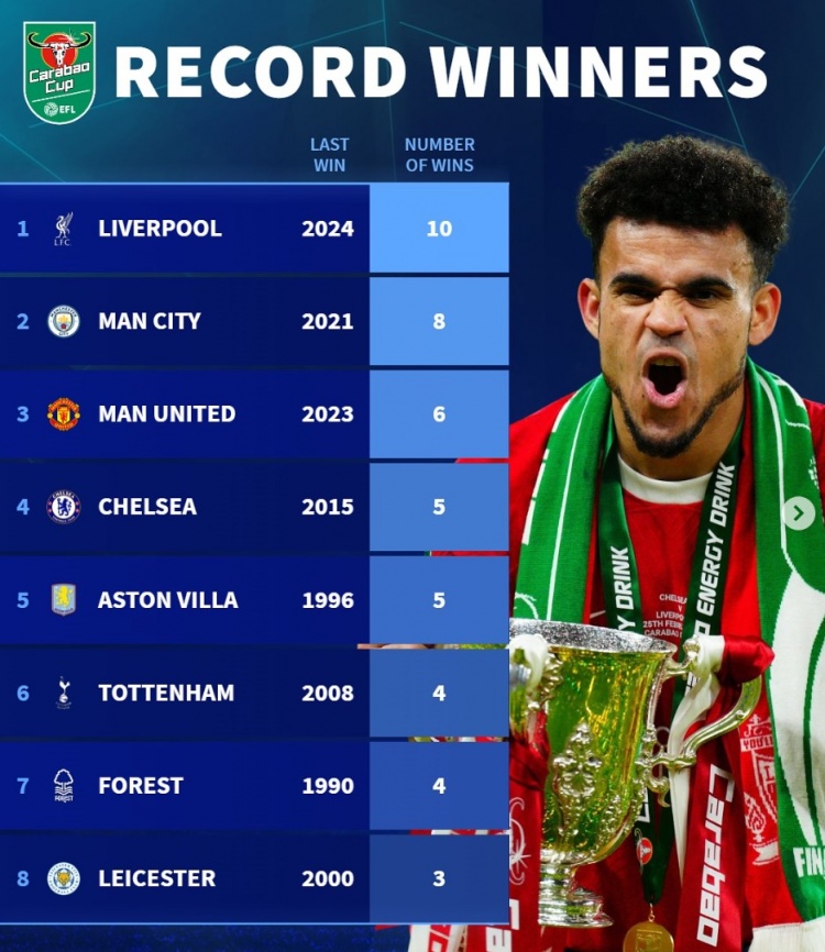2025-03-16 21:29:47聯(lián)賽杯歷史奪冠榜:利物浦10冠居首,曼城8冠、曼聯(lián)6冠