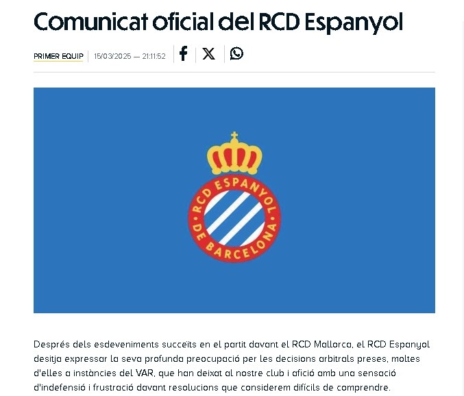 對陣馬洛卡的比賽后,西班牙人足球俱樂部對多項裁判判罰表達(dá)深切憂慮,尤其是在VAR干預(yù)下做出的決定,這些難以理解的判罰讓俱樂部和球迷感到無助與沮喪。