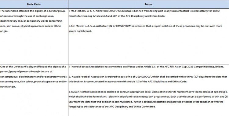 2025-03-17 16:18:22亞足聯(lián):科威特U17球員種族歧視行為被禁賽半年,足協(xié)罰款1萬美元