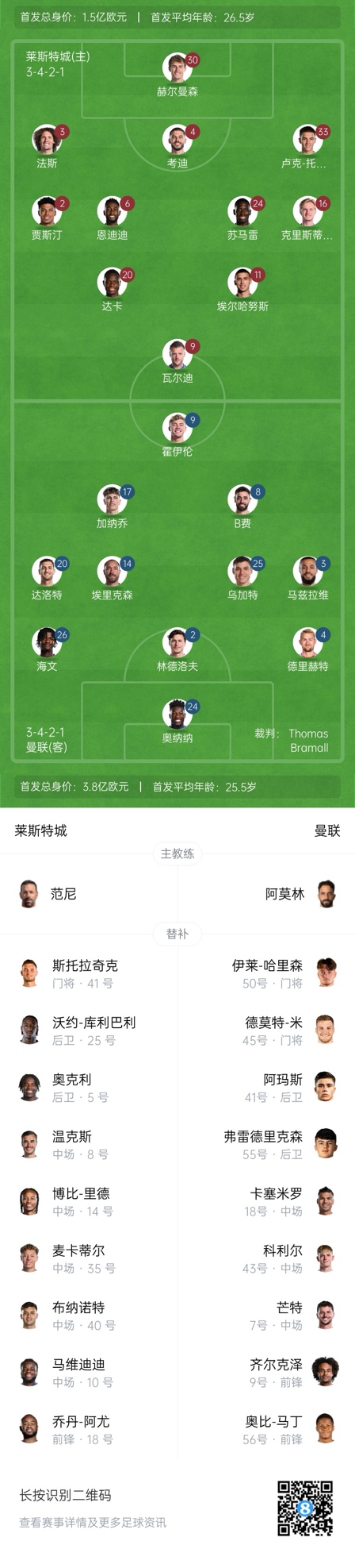 2025-03-17 16:39:07范尼戰(zhàn)舊主!曼聯(lián)vs萊斯特城首發(fā):霍伊倫加納喬出戰(zhàn),瓦爾迪先發(fā)