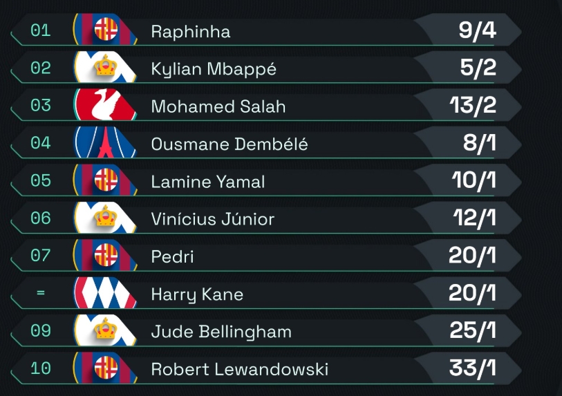 2025-03-18 08:21:13金球獎賠率:拉菲尼亞居首、姆巴佩第二,皇薩球員7人進前十