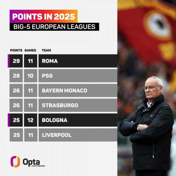 2025-03-18 08:23:44補(bǔ)天!2025五大聯(lián)賽拿分榜:羅馬壓巴黎居首,拜仁、利物浦在列