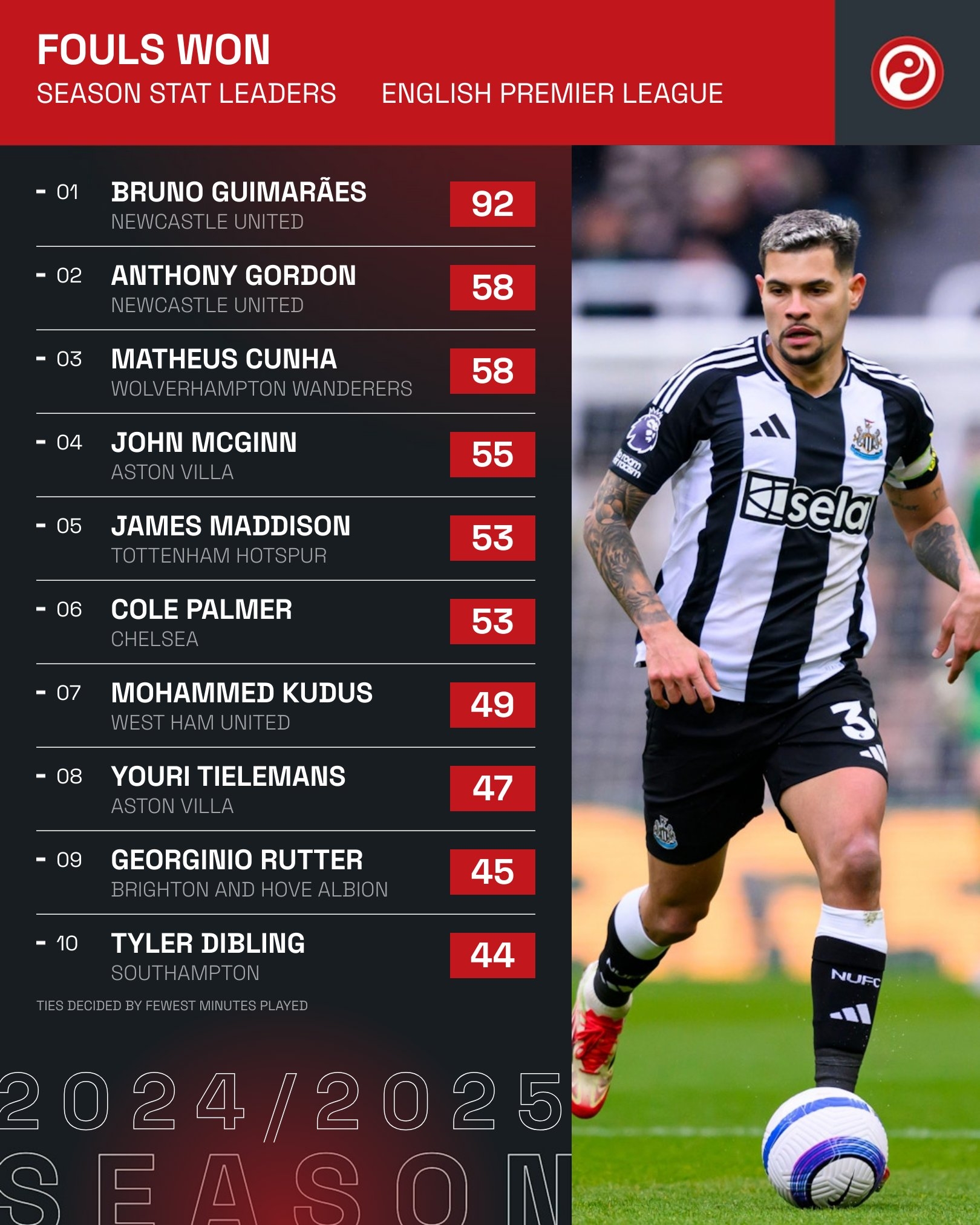 2025-03-18 08:24:26本賽季英超球員被犯規(guī)次數(shù)榜:吉馬良斯居首,麥迪遜、帕爾默在列