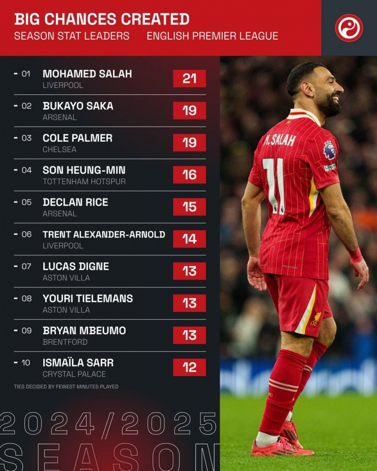 2025-03-18 08:24:47本賽季英超創(chuàng)造重大機(jī)會(huì)榜:薩拉赫21次居首,薩卡&帕爾默19次