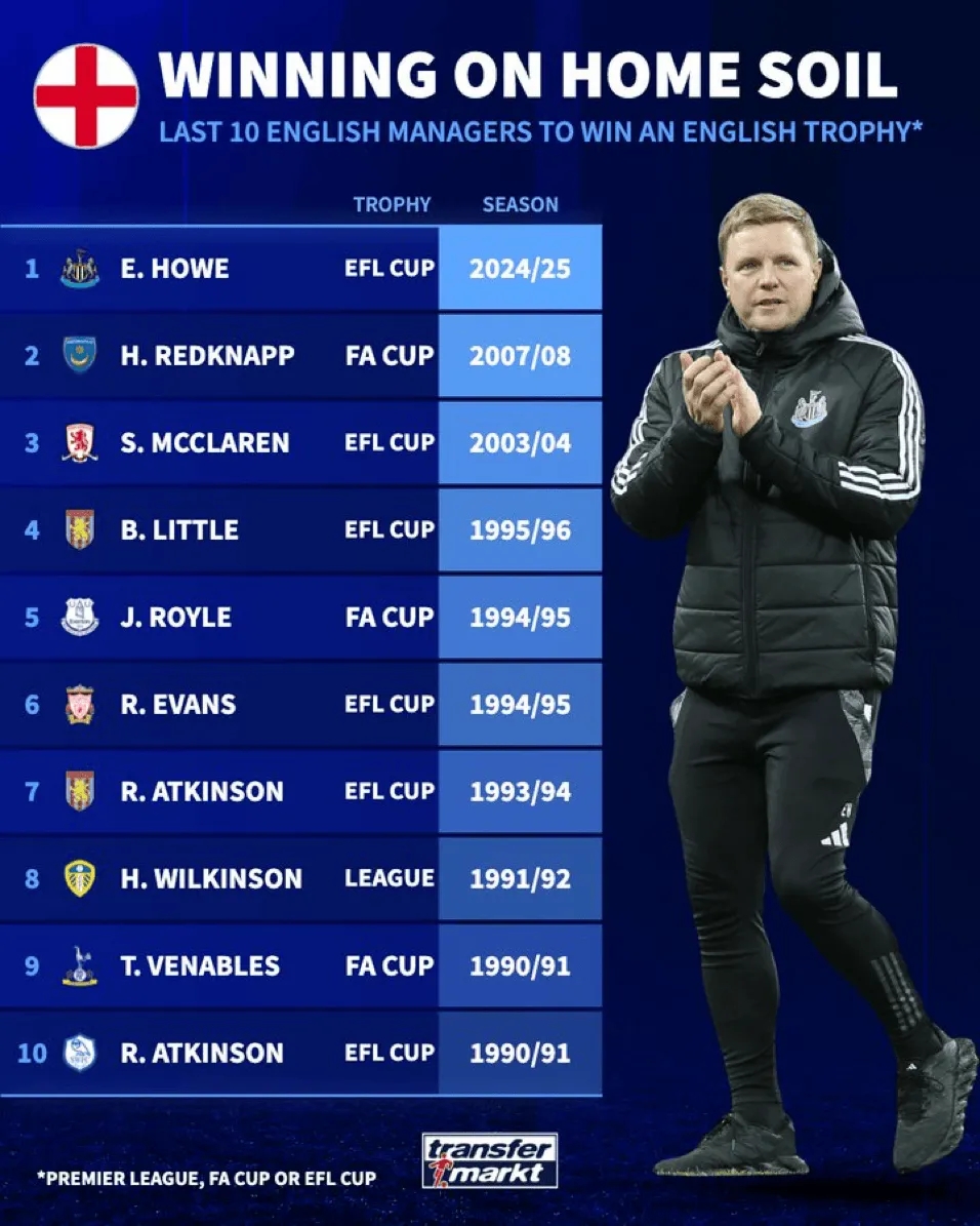 3月18日訊 紐卡在昨晚的聯(lián)賽杯決賽2-1擊敗利物浦,埃迪-豪也成為近年來首位帶隊捧得國內(nèi)冠軍的英格蘭本土主帥。