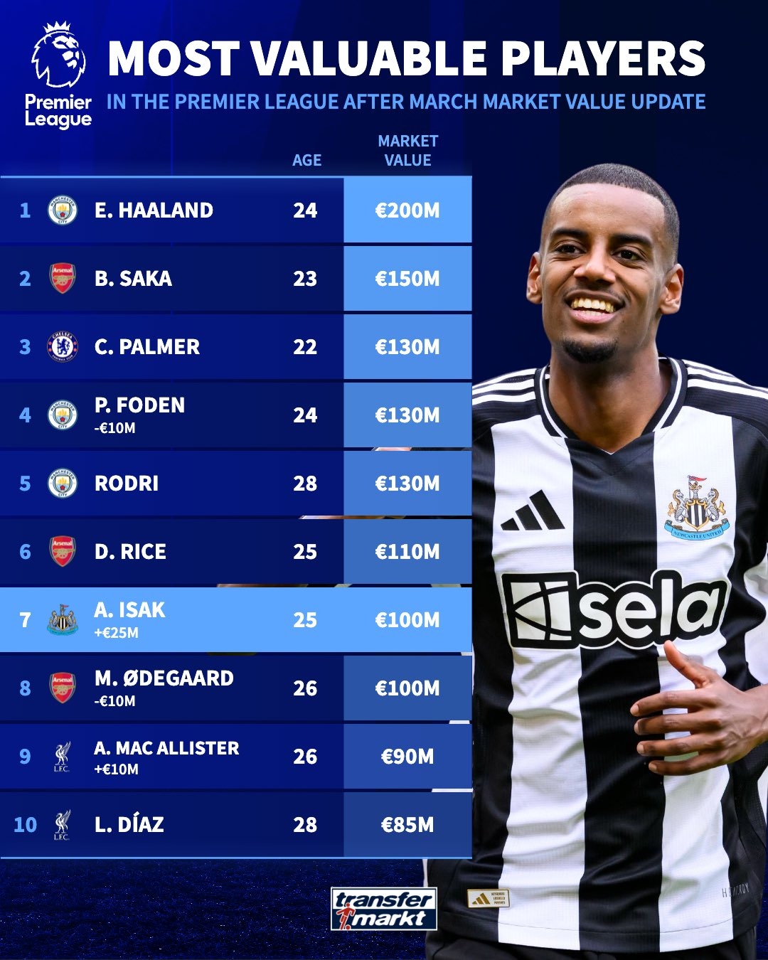 2025-03-18 21:09:45英超身價(jià)前30:哈蘭德2億薩卡1億5不變 伊薩克首破億恩瓦內(nèi)里入榜