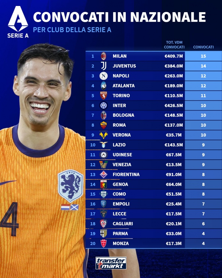 2025-03-18 21:11:04意甲國家隊征召人數:米蘭15人最多,尤文14人次席&國米10人