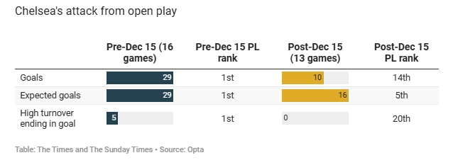 另外,切爾西在英超前16輪中利用高位失誤打進了5粒進球排名第一,而最近13輪比賽該項數(shù)據(jù)為0。
