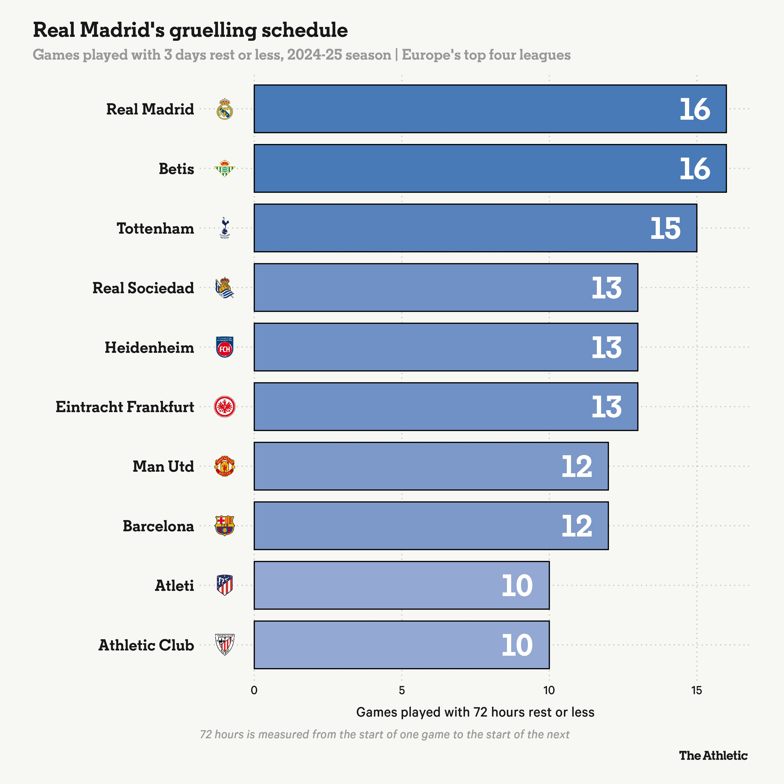 3月19日訊 根據(jù)The Athletic統(tǒng)計(jì),皇馬本賽季有16場比賽休息不多于72個小時(shí)。