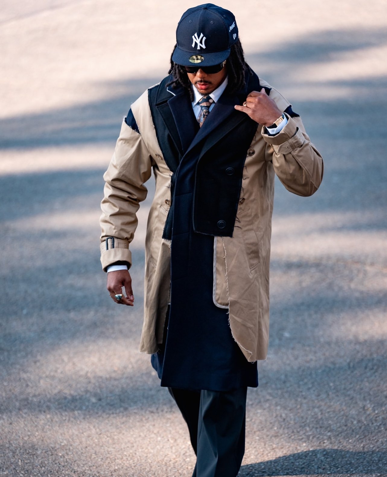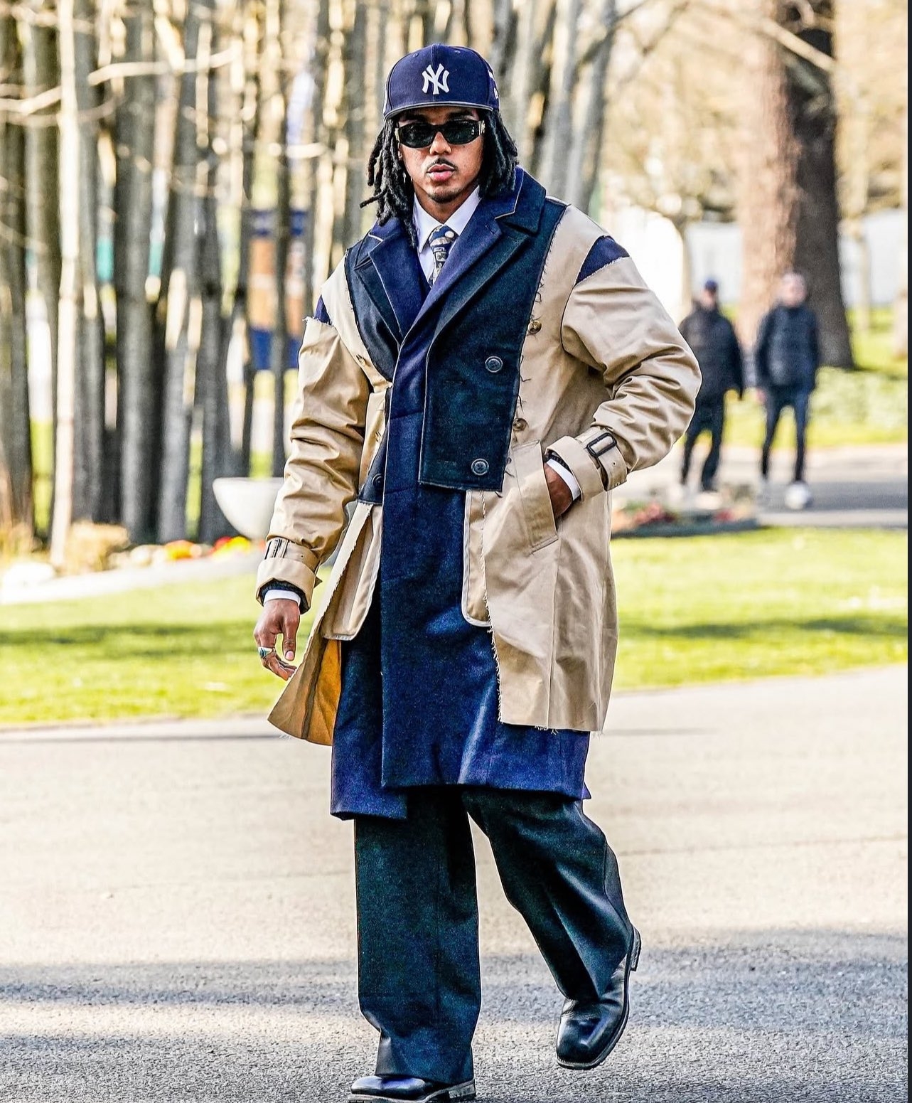 這一次孔德的穿搭中,最引人注目的就是他身上的拼接外套,這件大衣來自日本小眾設(shè)計(jì)師品牌FACETASM,是2022-23的秋冬系列中的一件。