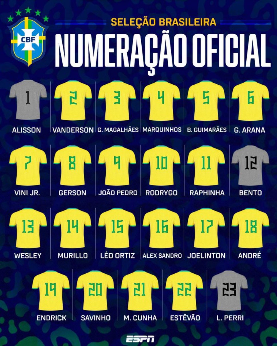 巴西最新號碼:若昂-佩德羅9號、維尼修斯7號、羅德里戈10號