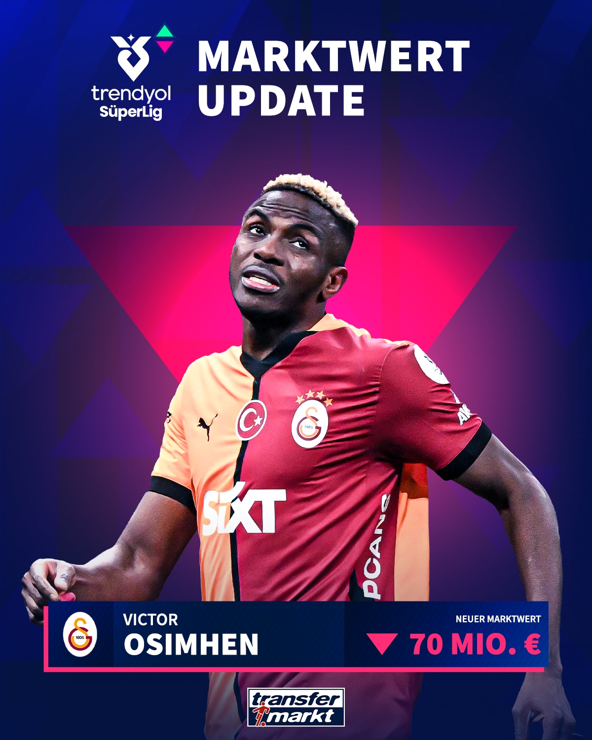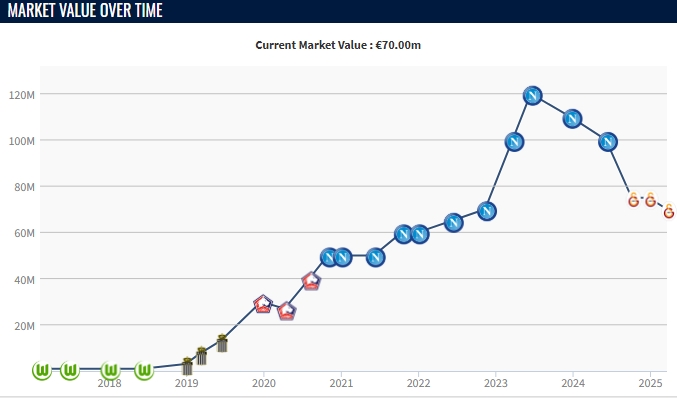 03月20日訊 德轉(zhuǎn)今日更新了土超球員身價(jià),本賽季租借至加拉塔薩雷的奧斯梅恩身價(jià)再次下跌500萬歐,目前身價(jià)7000萬歐。
