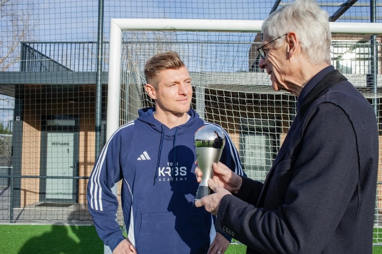 3月20日訊 目前擔(dān)任國(guó)際足聯(lián)全球足球發(fā)展主管的溫格造訪了克羅斯的青訓(xùn)學(xué)校,并為他頒發(fā)了FIFA2024年度最佳陣容獎(jiǎng)杯??肆_斯也更新社媒向溫格致謝。