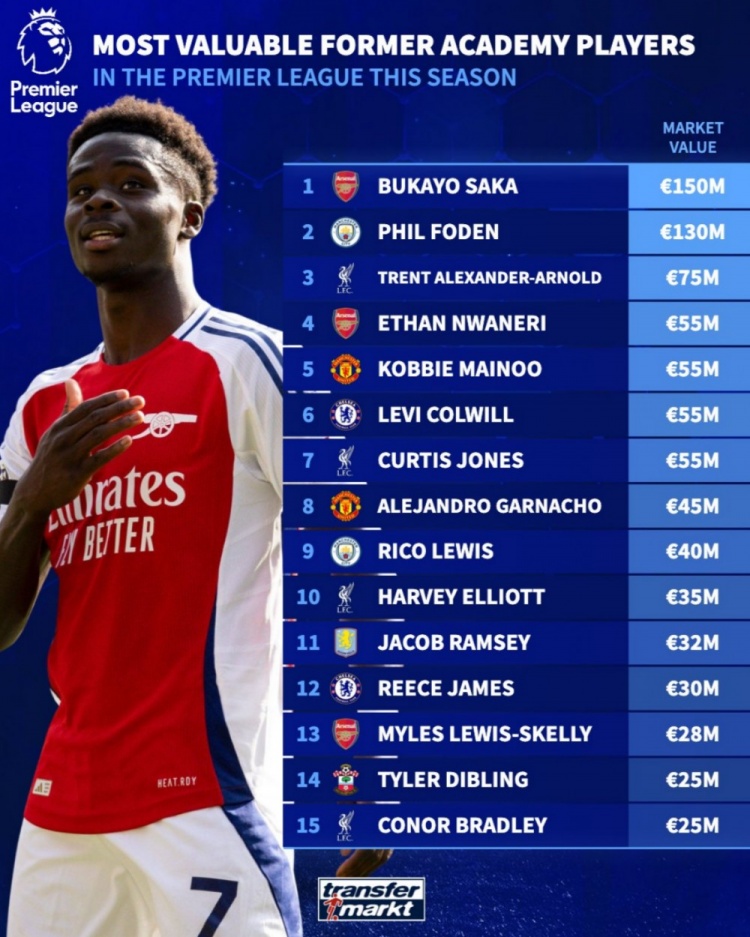 2025-03-20 23:15:19本賽季英超出自球隊(duì)青訓(xùn)球員身價(jià)榜:薩卡居首,福登&阿諾德在列