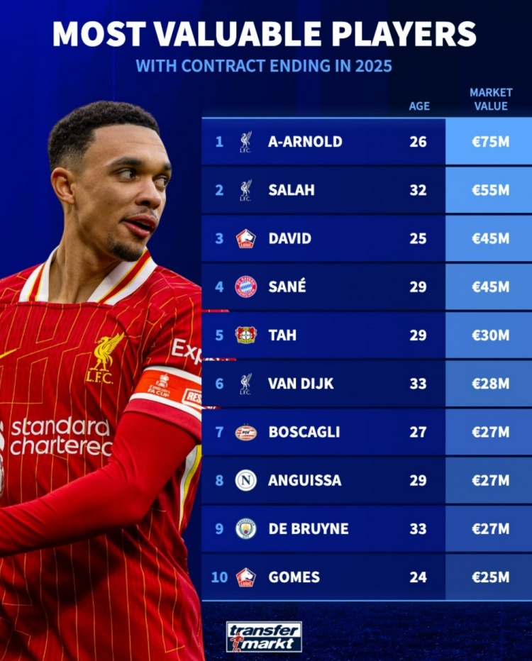 2025-03-20 23:16:09德轉(zhuǎn)列合同年球員身價榜:阿諾德居首,薩拉赫次席,薩內(nèi)在列