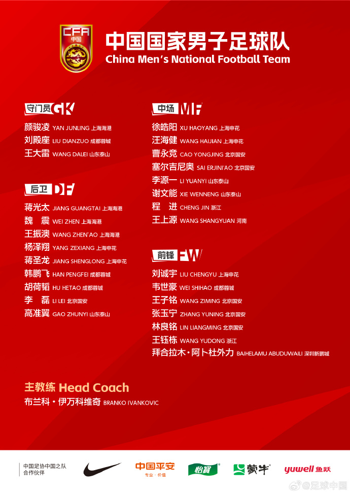 規(guī)則規(guī)定,中國(guó)隊(duì)本場(chǎng)比賽至多報(bào)名23名人。從相關(guān)訊息渠道獲知,根據(jù)球隊(duì)的訓(xùn)練情況,落選球隊(duì)本場(chǎng)比賽報(bào)名陣容的4名球員分別是來自國(guó)青前鋒王鈺棟、劉誠(chéng)宇、中場(chǎng)球員程進(jìn)、邊后衛(wèi)王振澳,歸化新人塞爾吉尼奧確定入選。