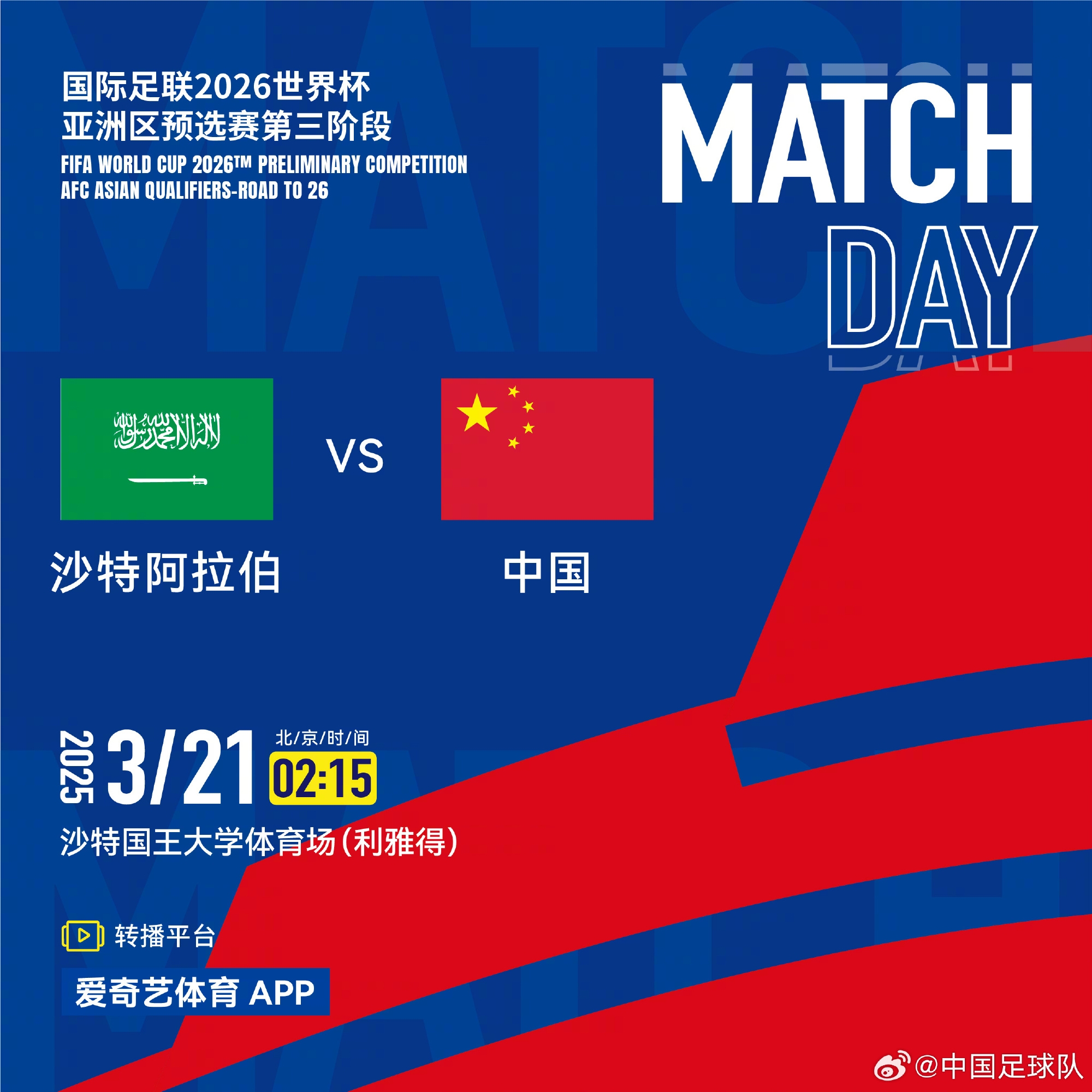 2025-03-20 23:24:17中國(guó)國(guó)家男子足球隊(duì)將在客場(chǎng)對(duì)陣沙特阿拉伯國(guó)家男子足球隊(duì)
