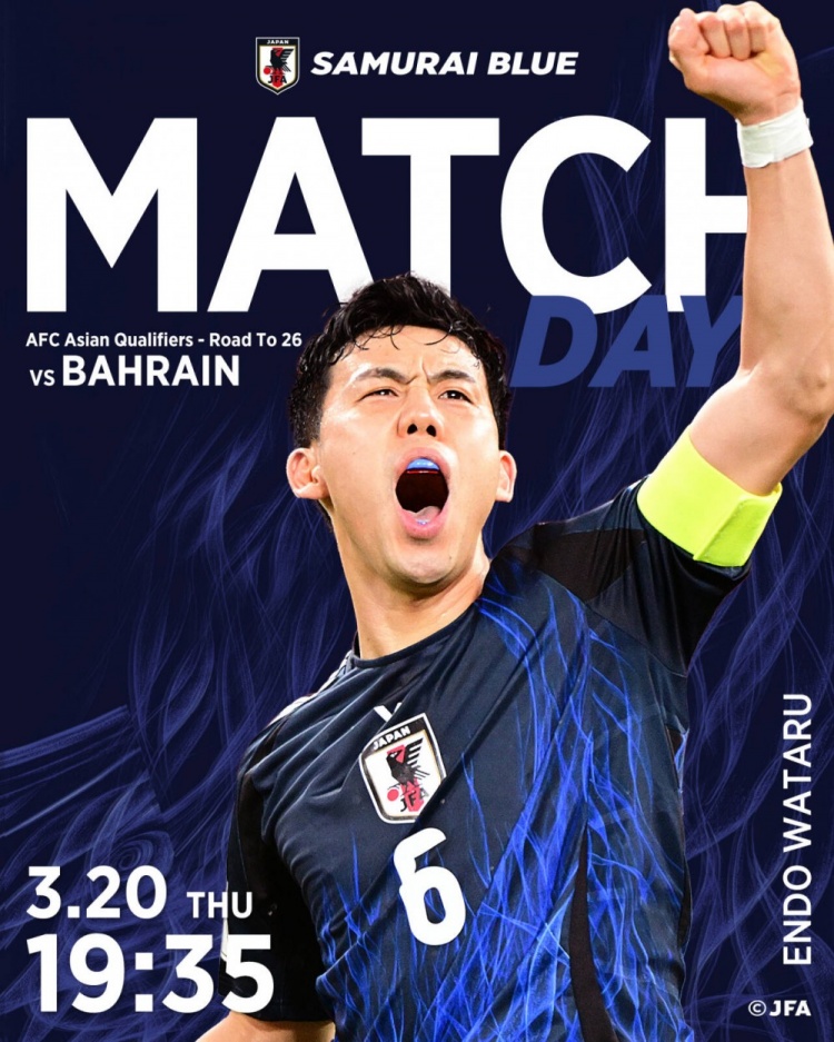 2025-03-20 23:29:24日本隊公布戰(zhàn)巴林海報:隊長遠藤航單人入鏡,振臂高呼
