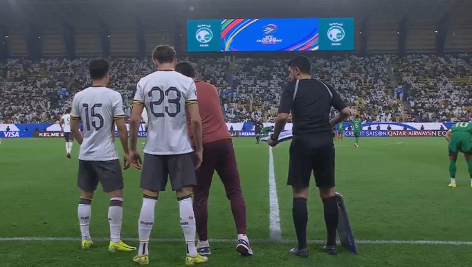 2025-03-21 09:30:17小動作,沙特球員與張玉寧對抗后,踩了一腳倒地的張玉寧