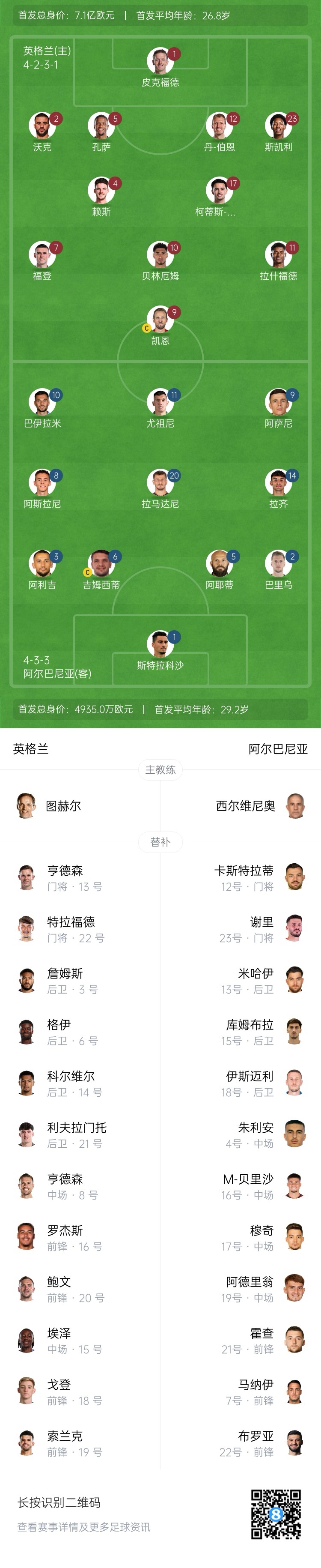 2025-03-22 10:17:27英格蘭vs阿爾巴尼亞首發(fā):凱恩、貝林、拉什福德先發(fā)、斯凱利首秀