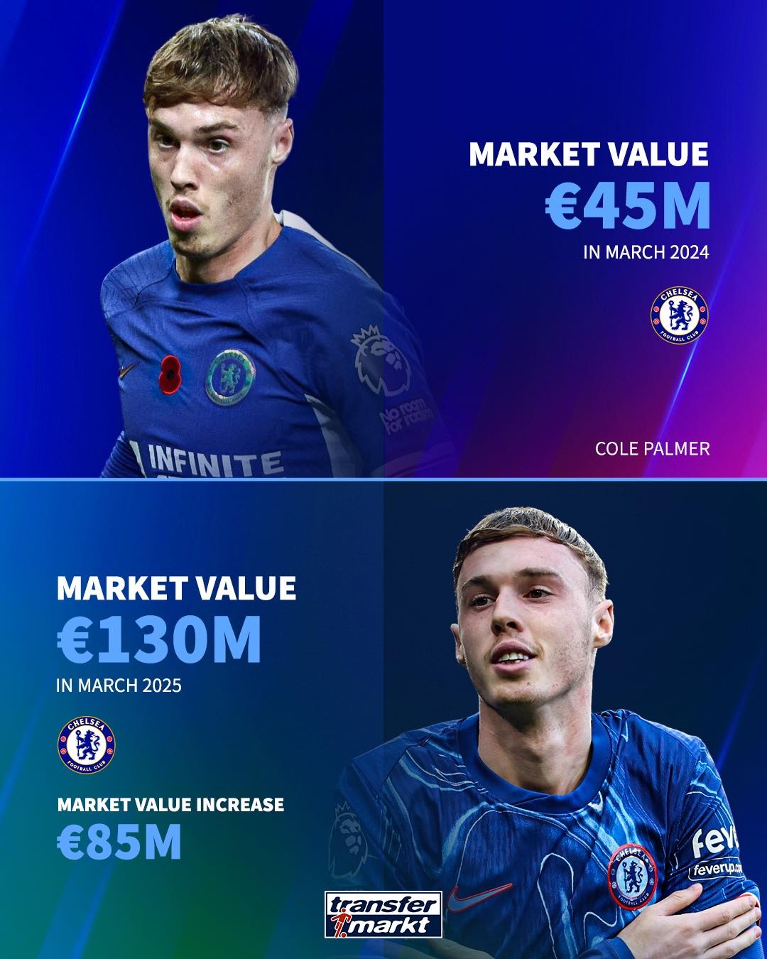 2025-03-23 17:48:16英超球員過去1年身價(jià)漲幅:帕爾默暴漲8500萬歐 馬爾穆什漲6000萬