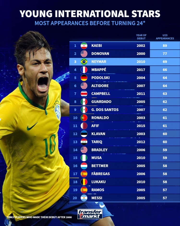 2025-03-23 17:57:4624歲之前國家隊出場榜:內馬爾69場第三,C羅61場&梅西57場