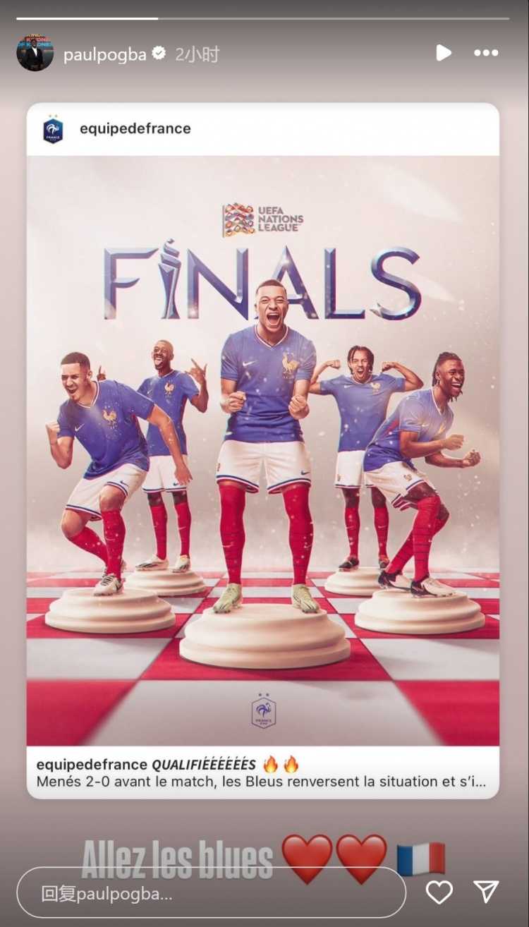 2025-03-24 09:25:09心系國家隊!博格巴社媒曬法國隊晉級海報:加油藍(lán)衣軍團(tuán)