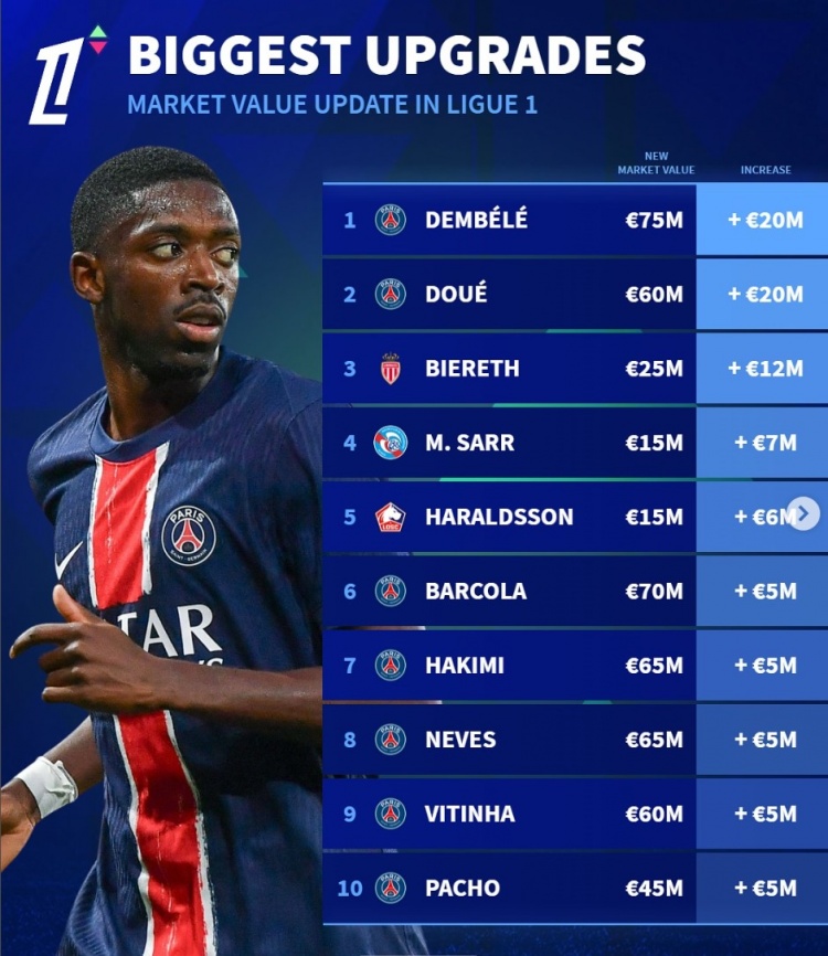 2025-03-25 02:36:43法甲身價(jià)更新升值榜:登貝萊&杜埃均上漲2000萬(wàn)歐,比雷斯在列