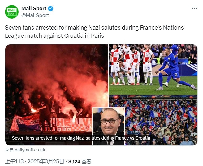 2025-03-25 13:00:44郵報:7名球迷因在法國vs克羅地亞比賽中行納粹禮,被警方拘留