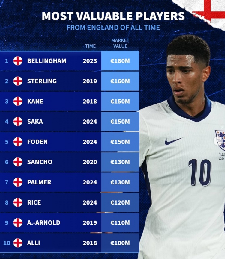 2025-03-25 13:12:05德轉(zhuǎn)列英格蘭隊史身價前十:貝林厄姆1.8億,斯特林、阿里均上億
