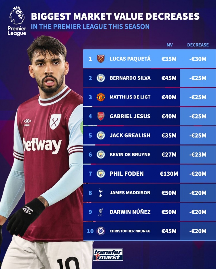 本賽季英超球員德轉(zhuǎn)身價(jià)下跌榜(括號(hào)內(nèi)為目前身價(jià)):