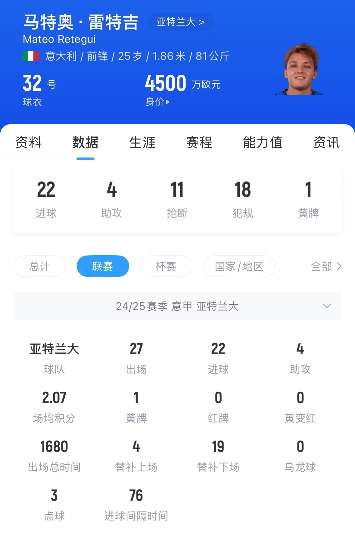 2025-03-26 20:31:21要價6000萬!25歲雷特吉27輪22球意甲第1 身價漲至4500萬多隊有意