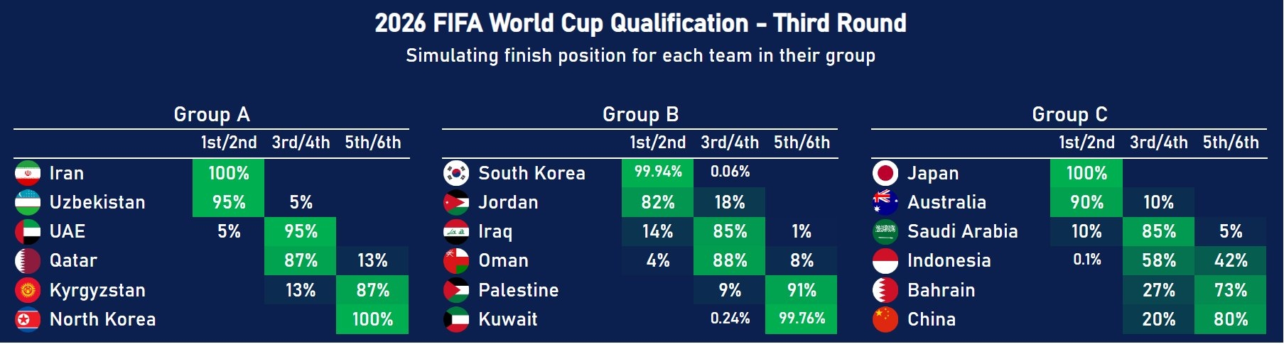 其中中國(guó)隊(duì)20%排3/4(附加賽),80%排在5/6(無緣世界杯),而印尼58%概率獲得附加賽資格。