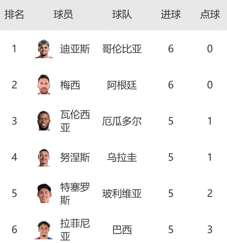 2025-03-26 20:43:10南美區(qū)世預(yù)賽射手榜:迪亞斯6球平梅西并列榜首,努涅斯&拉菲5球