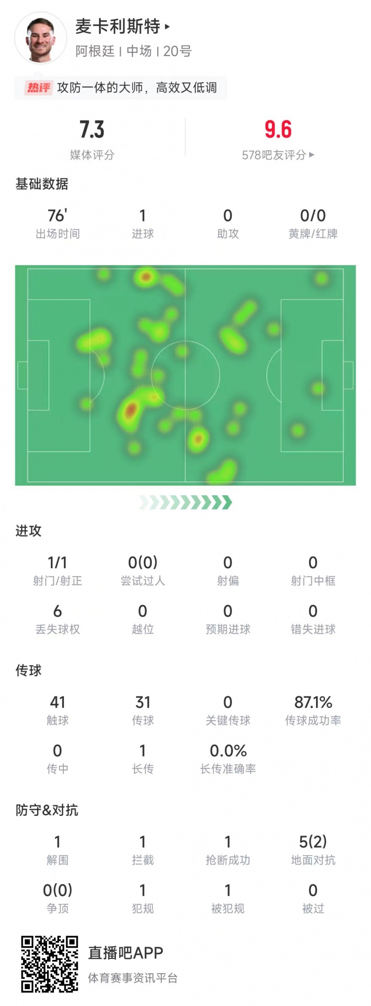2025-03-26 20:44:26麥卡利斯特本場數(shù)據(jù):射門1次打進1球,傳球成功率87.1%&評分7.3