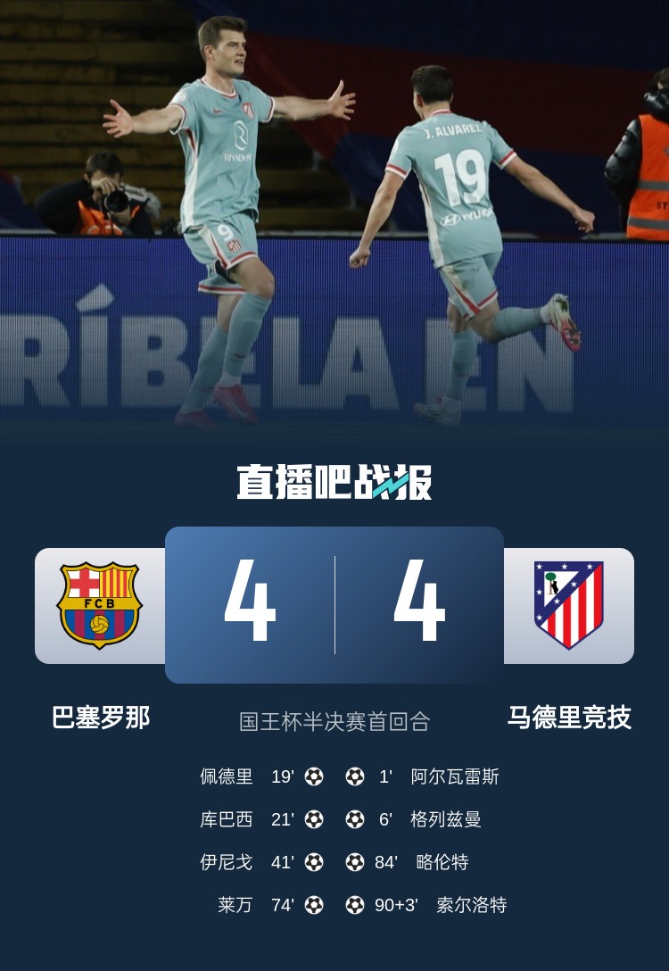 國王杯半決賽首回合,巴薩4-4遭馬競絕平,本場雙方上演進(jìn)球大戰(zhàn)!