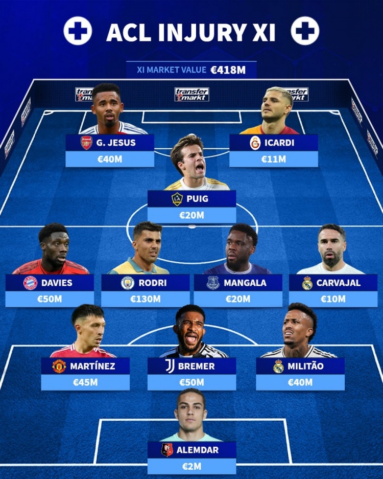 德轉(zhuǎn)排本賽季十字韌帶受傷陣容(總價(jià)4.18億歐):