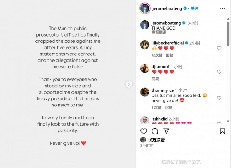 2025-03-27 08:47:30博阿滕更新社媒,慶賀針對(duì)他的家暴指控被撤銷
