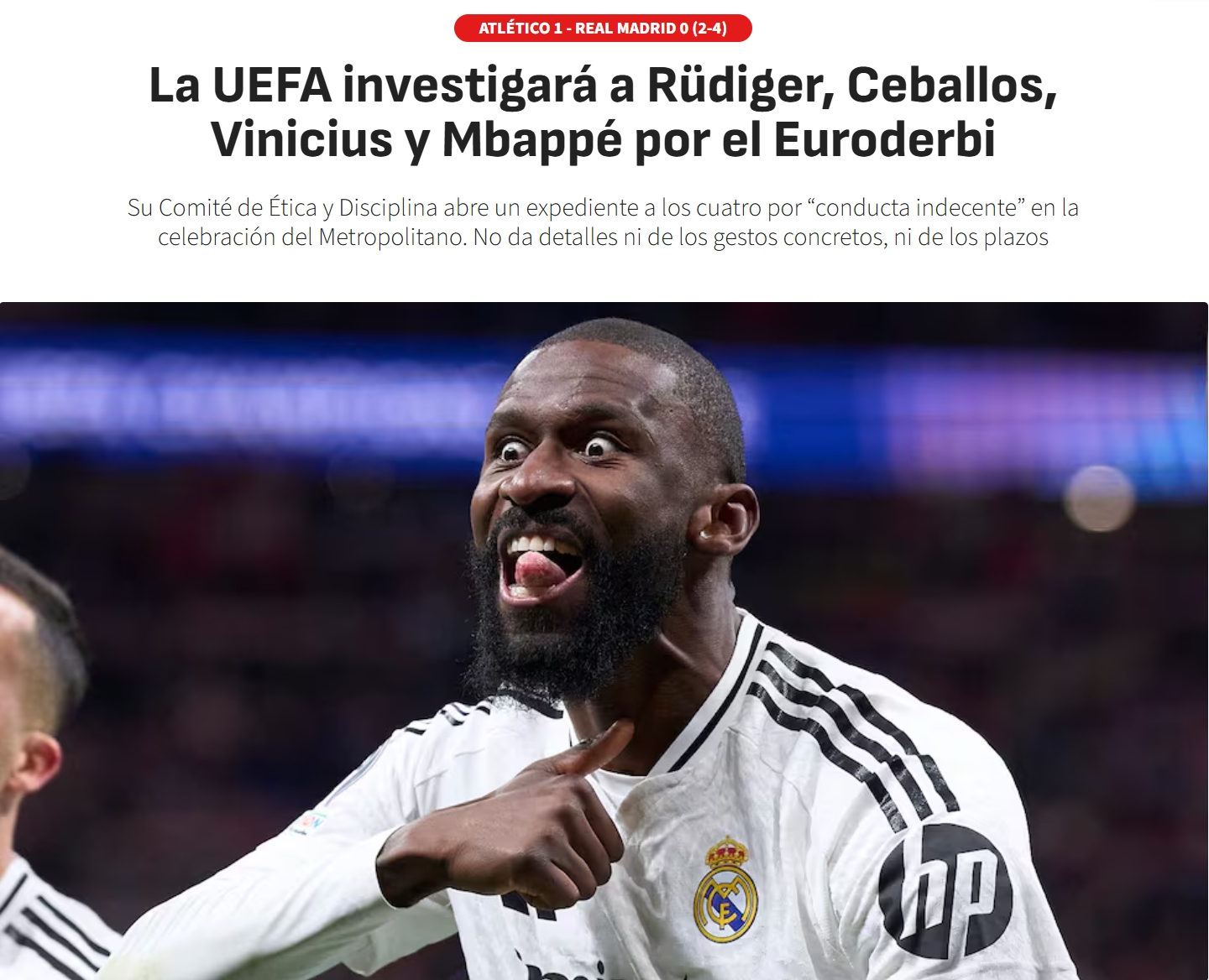 據(jù)此前報道,在皇馬vs馬競次回合比賽后,馬競方面向歐足聯(lián)提交了四段視頻,指控皇馬球員的不當(dāng)行為。其中包括:呂迪格對馬競球迷做出抹脖子手勢、維尼修斯多次挑釁觀眾、塞巴略斯進(jìn)入球員通道時做出粗魯手勢,以及姆巴佩面對馬競球迷觸摸自己隱私部位。