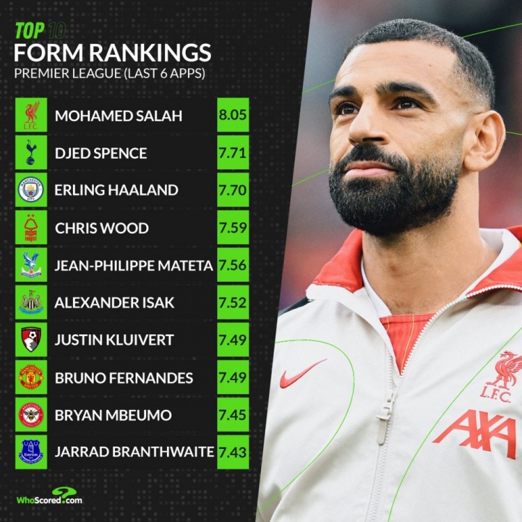 2025-02-26 08:11:21英超近期狀態(tài)榜:薩拉赫獨(dú)自領(lǐng)跑,斯賓塞、哈蘭德、B費(fèi)在列