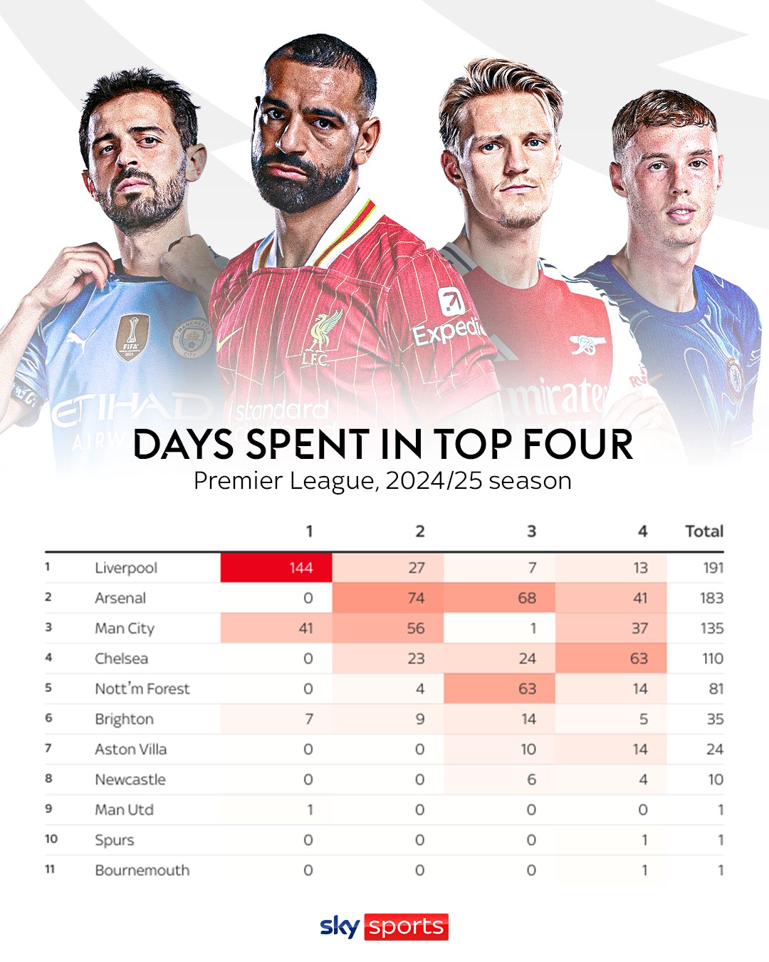 2025-02-26 08:11:30沒想到吧!利物浦已144天排名榜首 曼城41天 布萊頓7天 曼聯(lián)1天