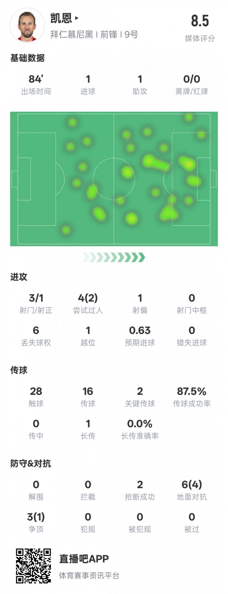 2025-03-30 02:52:49凱恩本場(chǎng)數(shù)據(jù):傳射建功&2關(guān)鍵傳球2過(guò)人成功,評(píng)分8.5