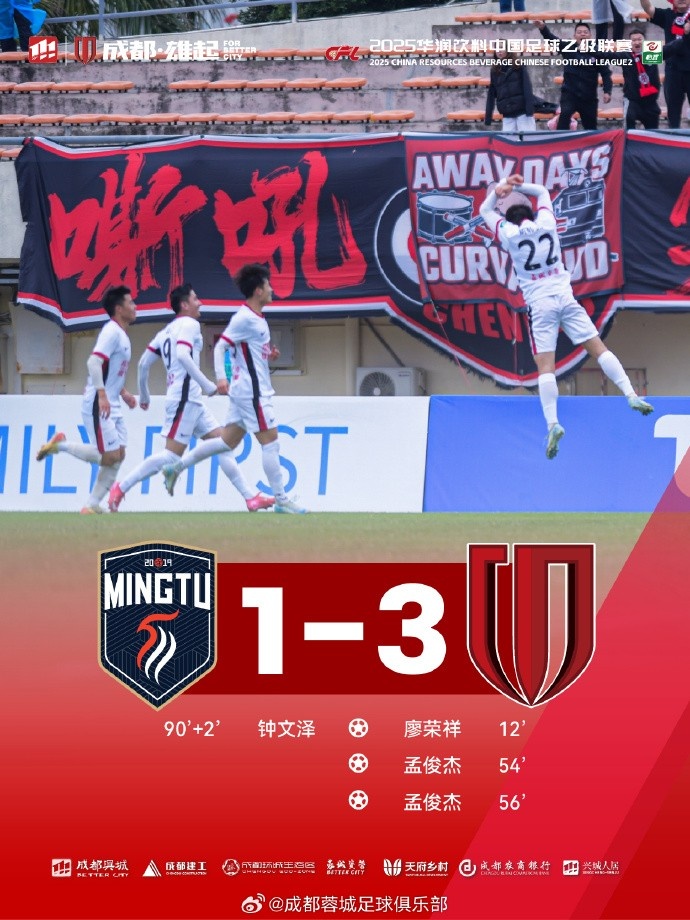 2025-03-30 20:10:33孟俊杰造點+梅開二度,成都蓉城B隊客場3-1戰(zhàn)勝廣東銘途隊