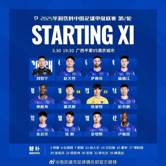 2025-03-30 20:10:36南京城市2025賽季客場首戰(zhàn)首發(fā)陣容!