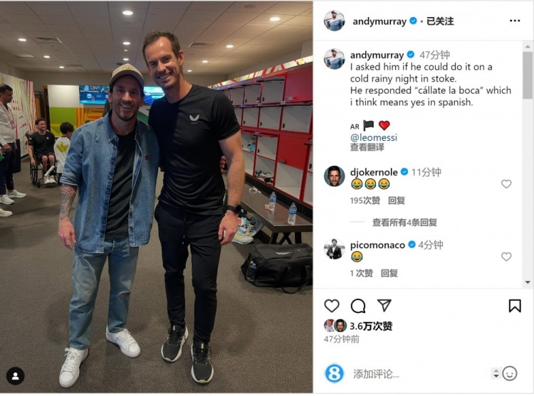 3月30日訊 德約科維奇現(xiàn)任教練、三座大滿貫得主穆雷更新社媒動(dòng)態(tài),曬出與梅西的合照。