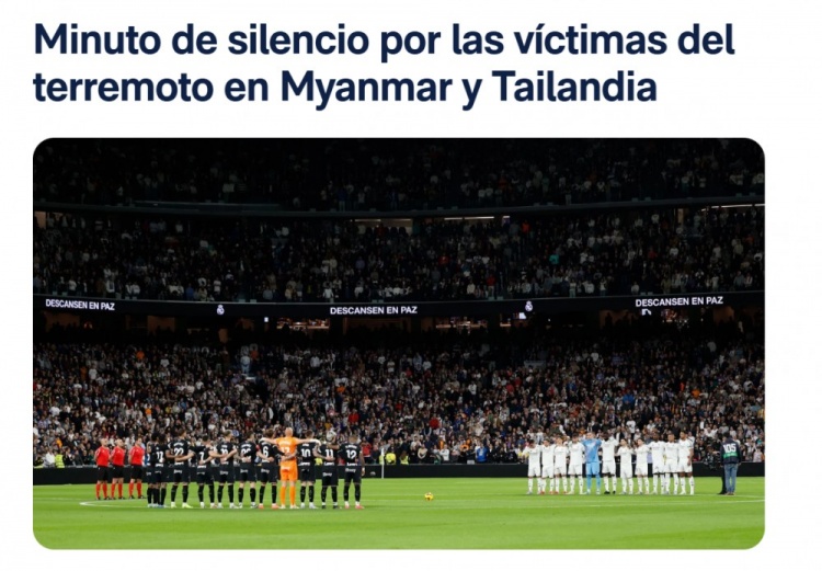 皇馬官網(wǎng)寫道:圣地亞哥-伯納烏球場在皇家馬德里與萊加內(nèi)斯的比賽開始前默哀一分鐘,悼念緬甸和泰國地震中的數(shù)千名遇難者。兩隊球員都佩戴了袖標(biāo)。