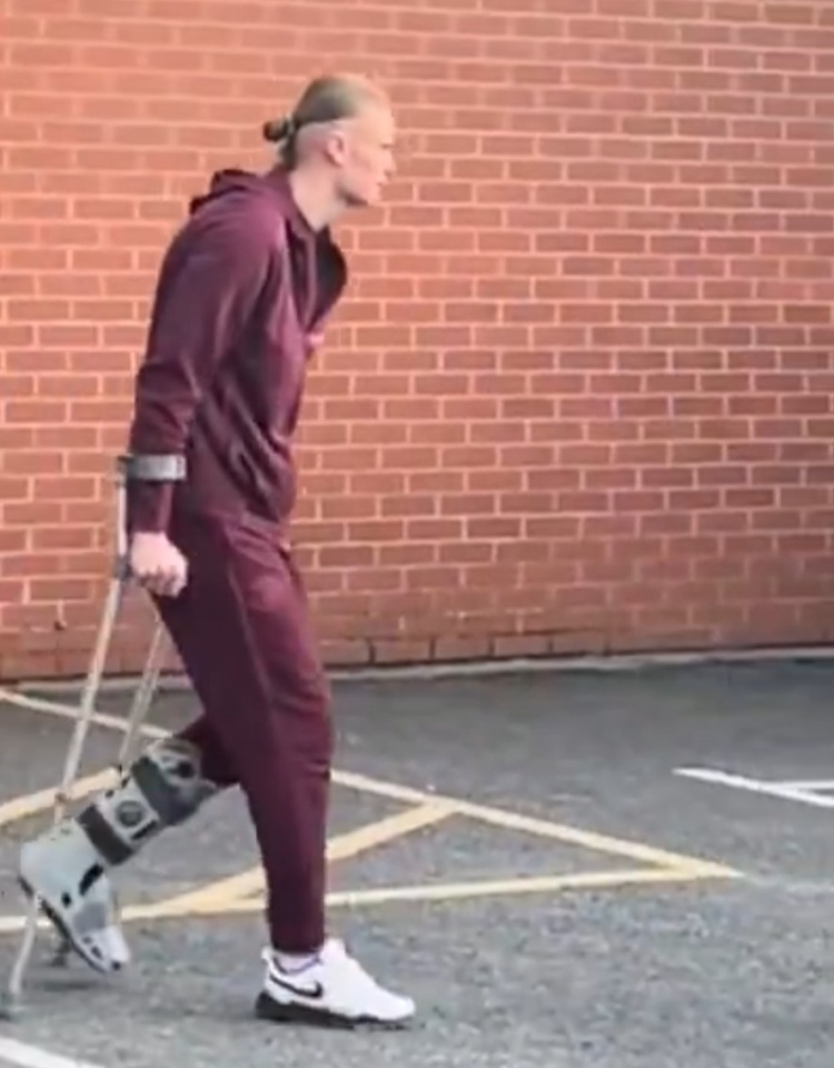 據(jù)賽后球迷拍到的畫面,哈蘭德拄拐離開(kāi)球場(chǎng),并且腳上穿著保護(hù)靴。