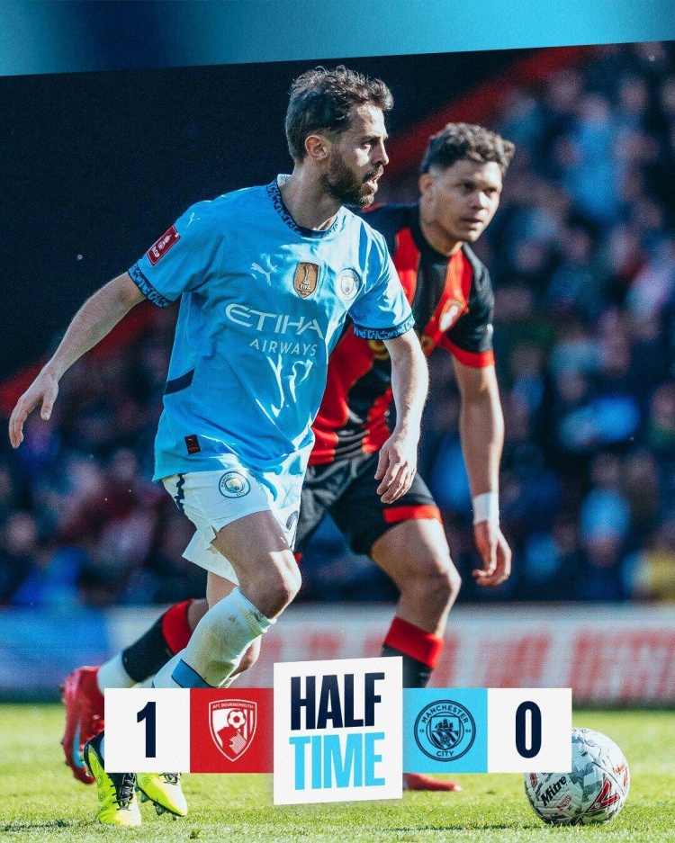 上半場傷停補(bǔ)時(shí)1分鐘,半場結(jié)束,伯恩茅斯暫1-0曼城。